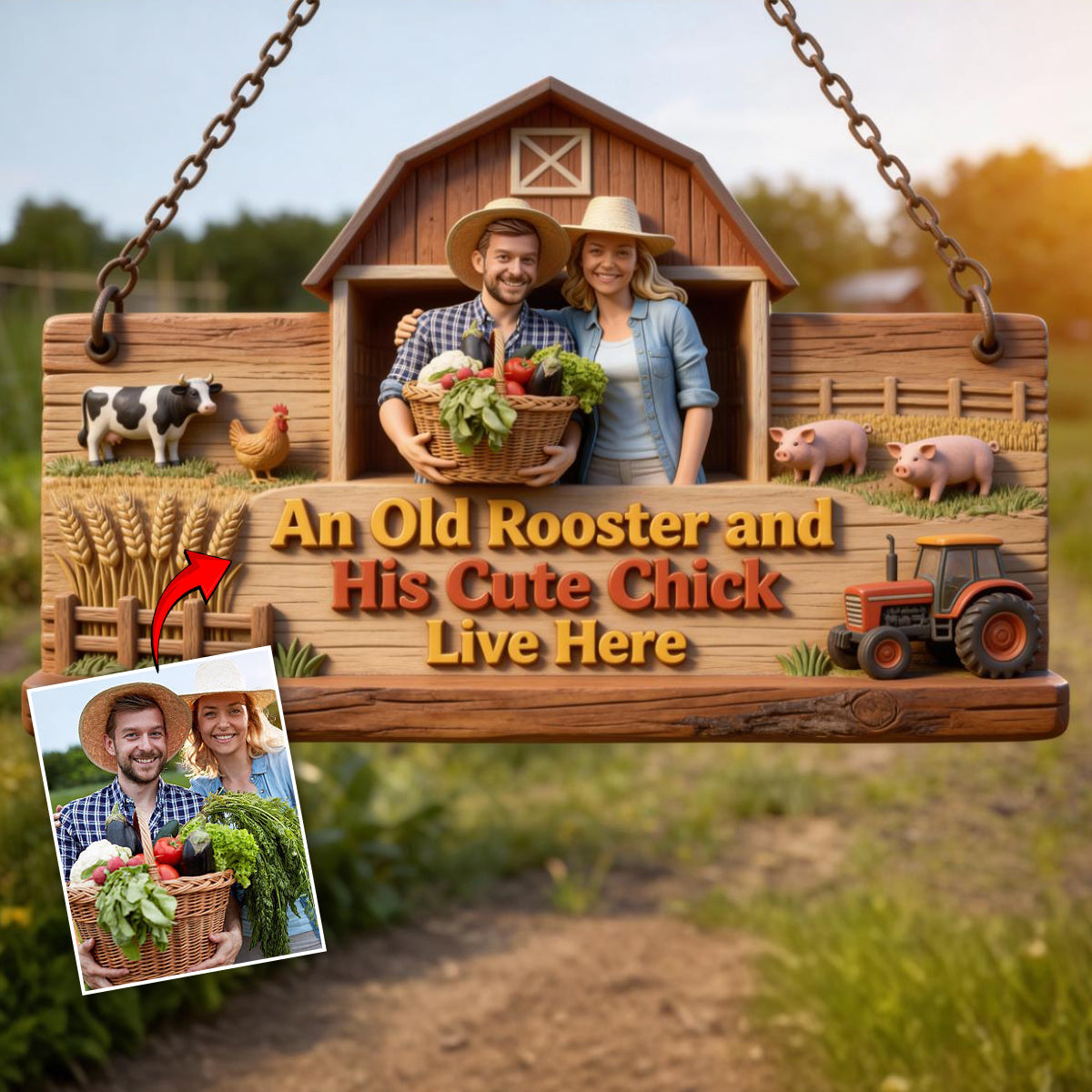 Bauernpaar, ein alter Hahn und sein süßes Küken leben hier - personalisiertes Bauern-Holzschild in individueller Form