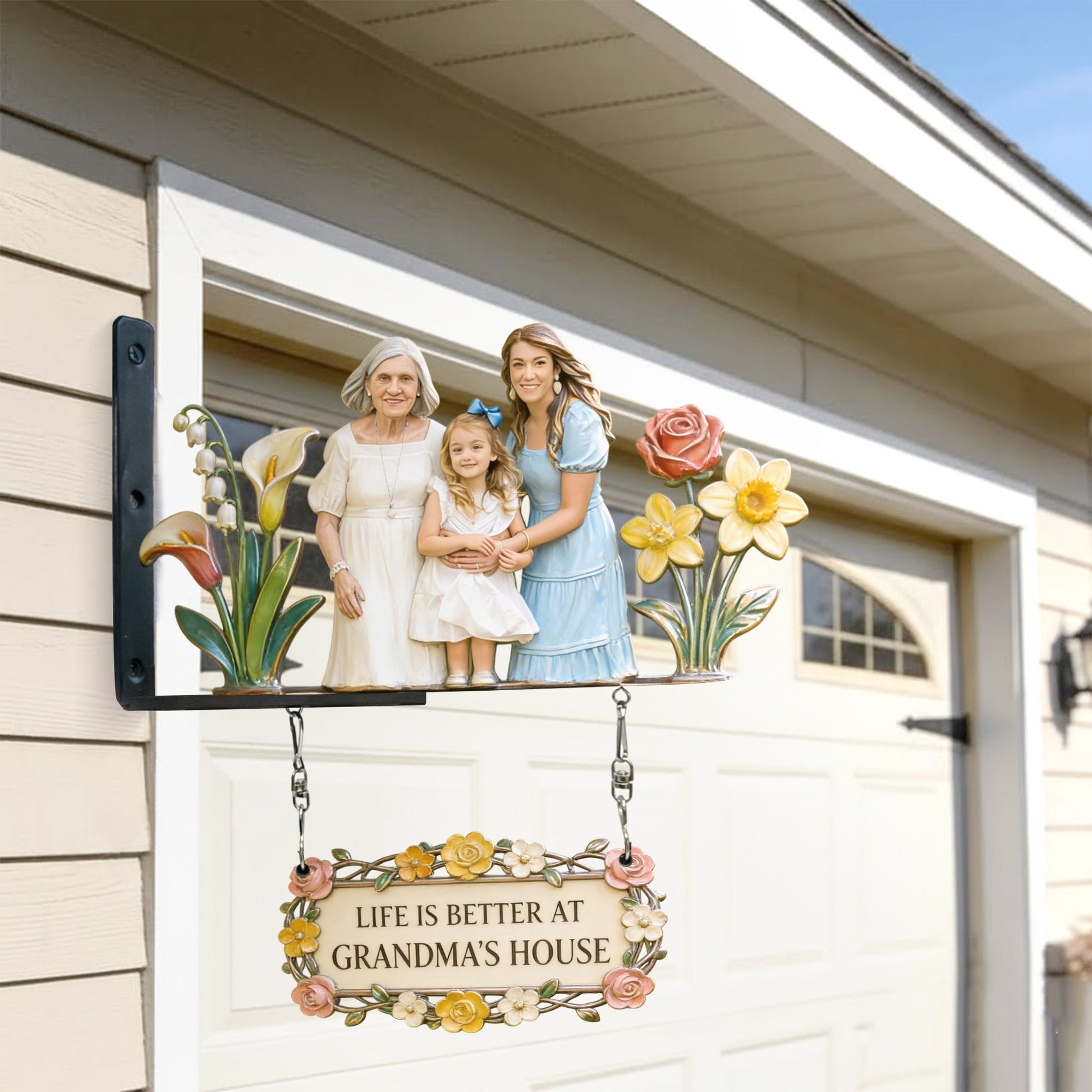 - Bottom hanging sign is optional and attached with metal chains for a classic swinging effect.