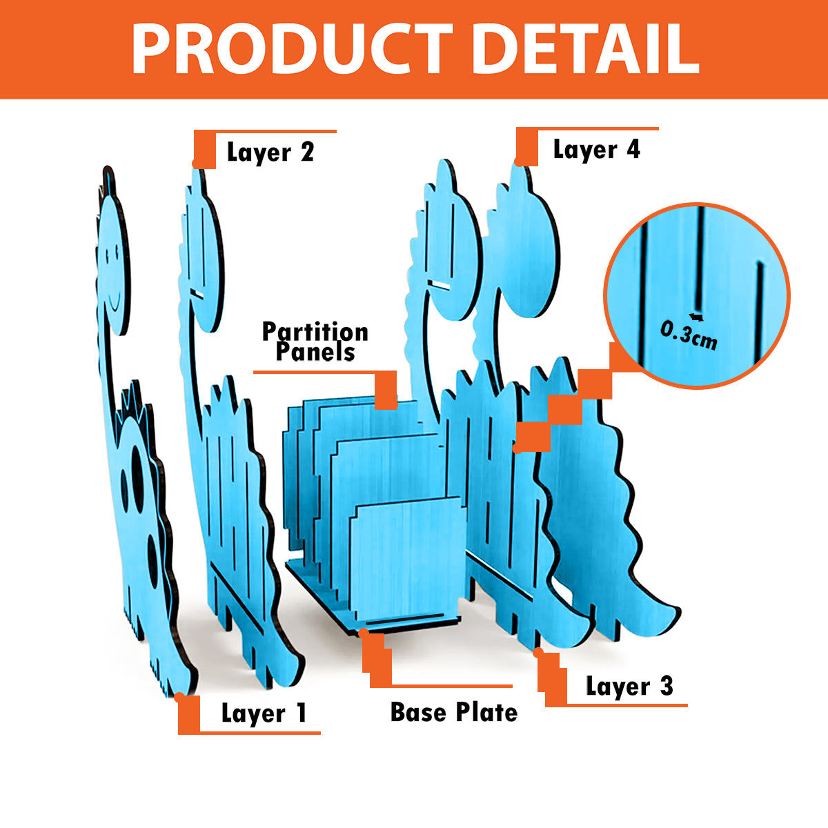 Elevate your workspace, study area, or teaching space with our Wooden Pen Holder, designed to combine functionality with a premium aesthetic. Crafted from high-quality 3mm thick wooden boards, each layer (Layer 1, 2, 3, and 4) is precision-cut to ensure durability and smooth edges. This robust, multi-layered holder is built to last, adding a premium touch to any environment, whether at home, in the office, or in the classroom.