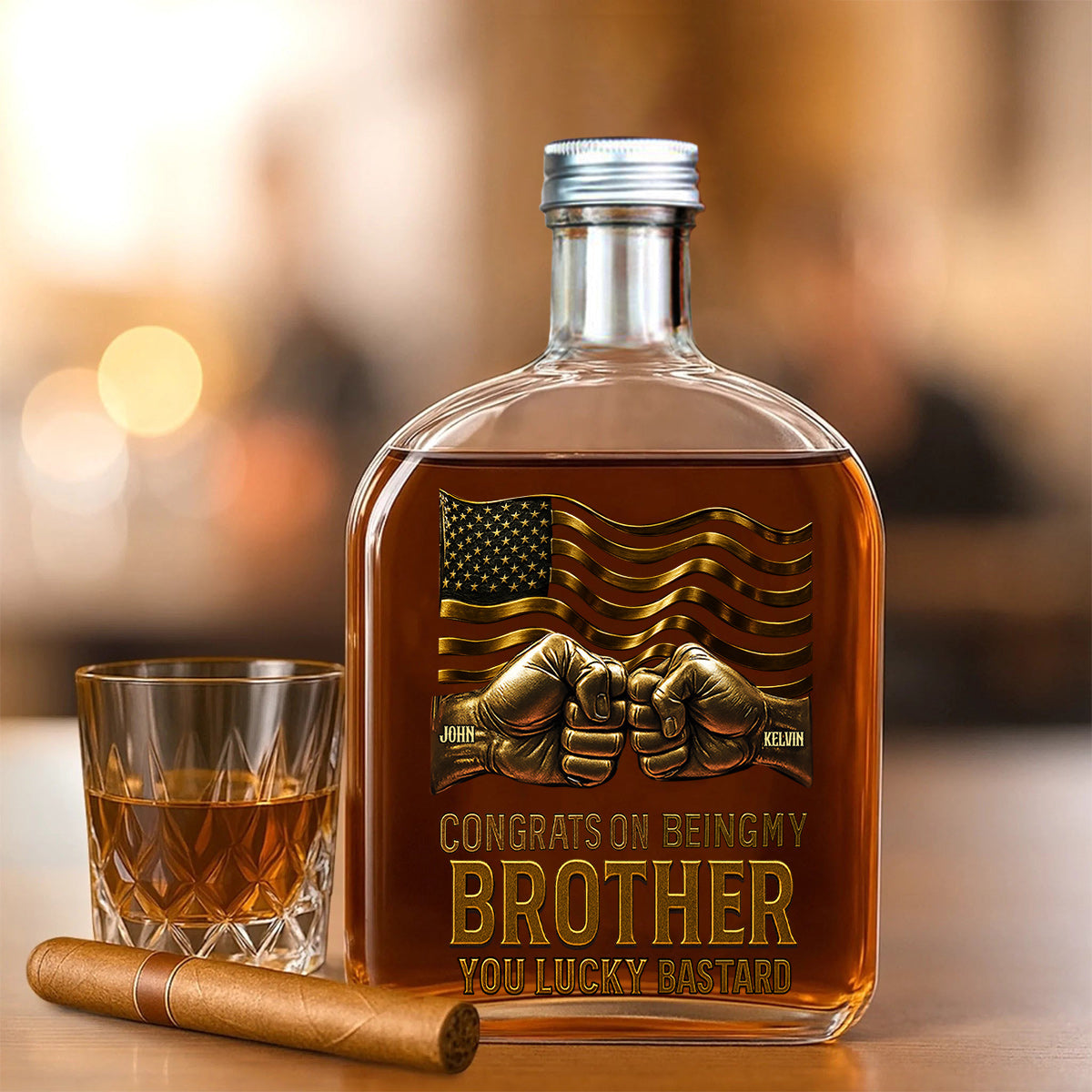 Elevate your home bar with this Personalized Whiskey Bottle, the perfect combination of elegance and practicality. Crafted from high-quality glass, this bottle serves as a stunning statement piece for special occasions and celebrations. Whether you're gifting it for birthdays, holidays, anniversaries, graduations, or simply to show someone you care, this bottle is sure to bring joy and create lasting memories. Its double-sided UV printed design adds a vibrant, long-lasting touch to any collection. The bottle's size of 16.7x9.4x4.2cm (6.57x3.7x1.65 inches) makes it a striking yet versatile piece, ideal for any bar, shelf, or display area.