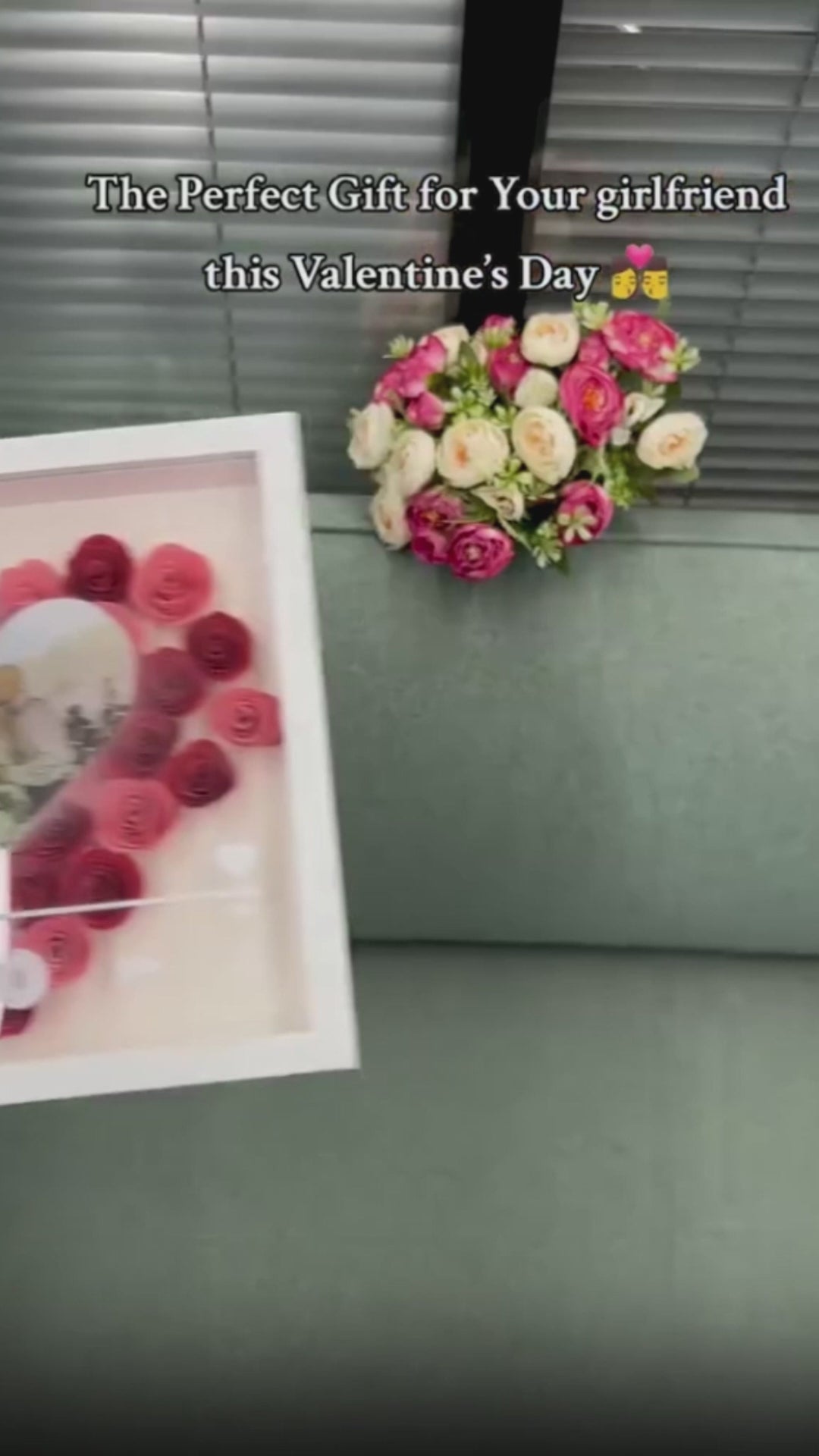 This heart-shaped flower shadow box contains hand-rolled PE foam flowers in various shades.