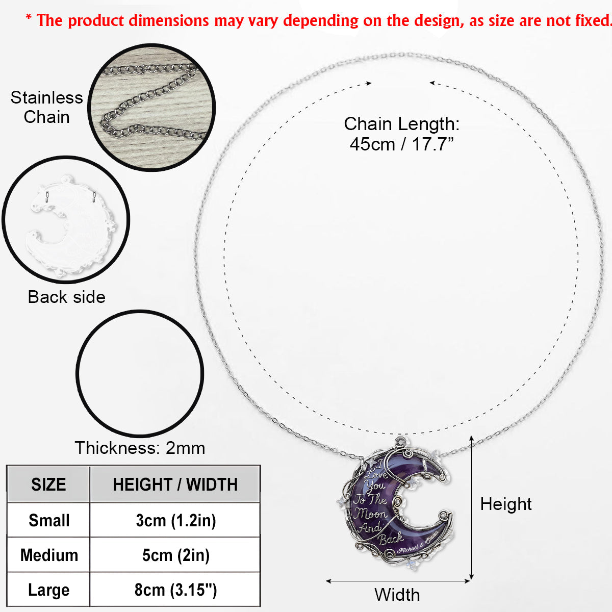 Add a personal touch to your jewelry collection with our Custom Shaped Pendant Necklace, crafted from durable stainless steel for long-lasting shine and style. This pendant is available in three sizes—3cm (1.18 inches), 4cm (1.57 inches), and 8cm (3.15 inches)—and features UV printing technology for vibrant, high-quality designs that stand the test of time.