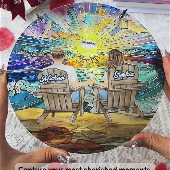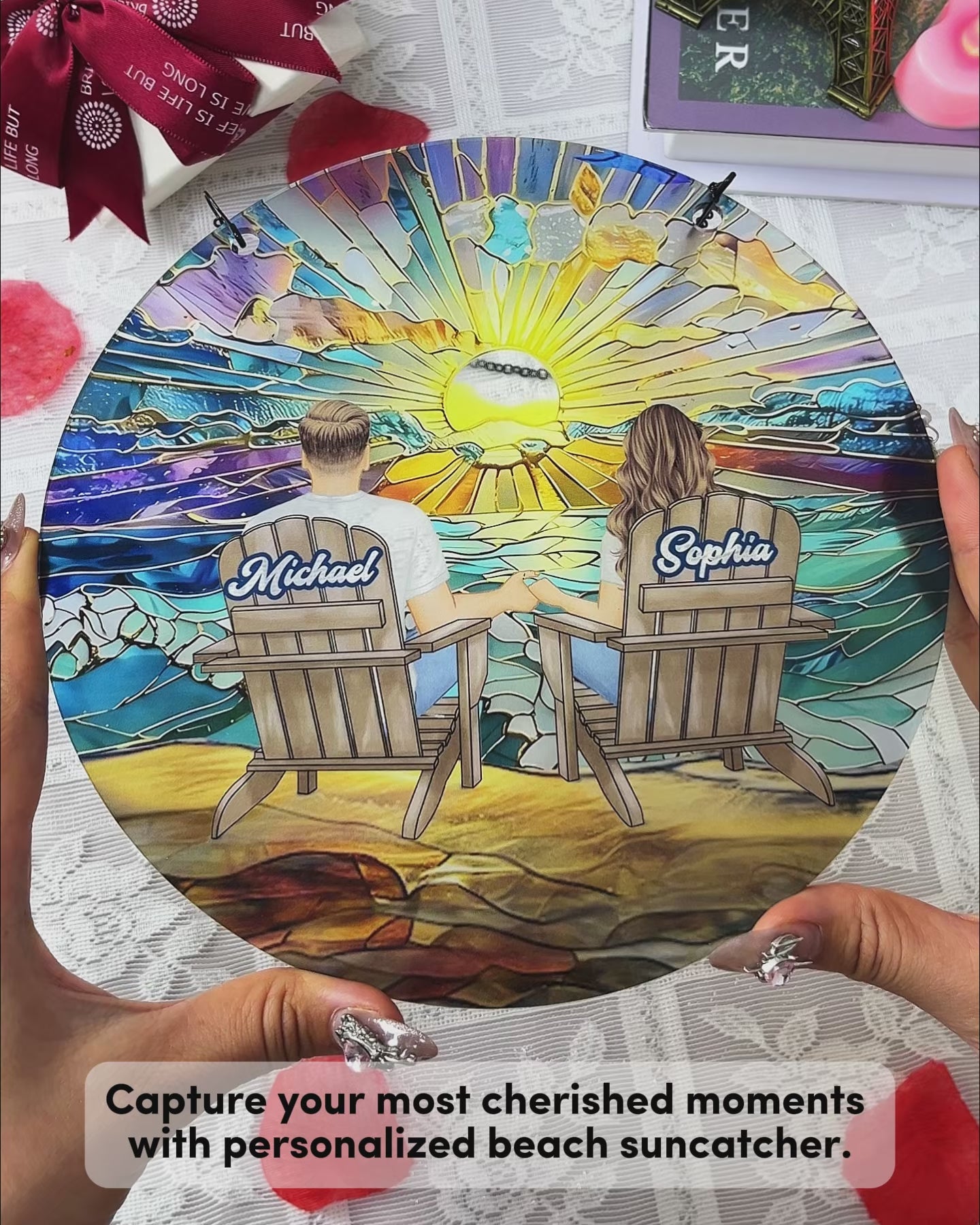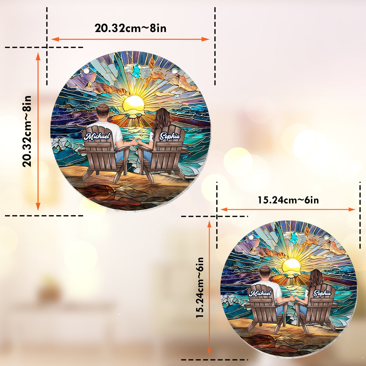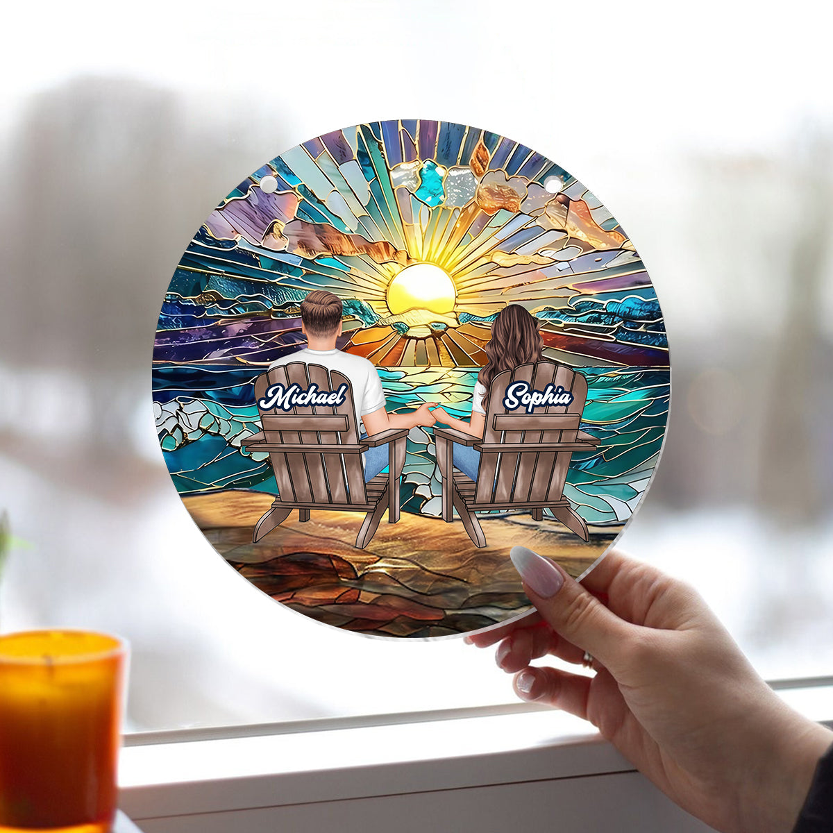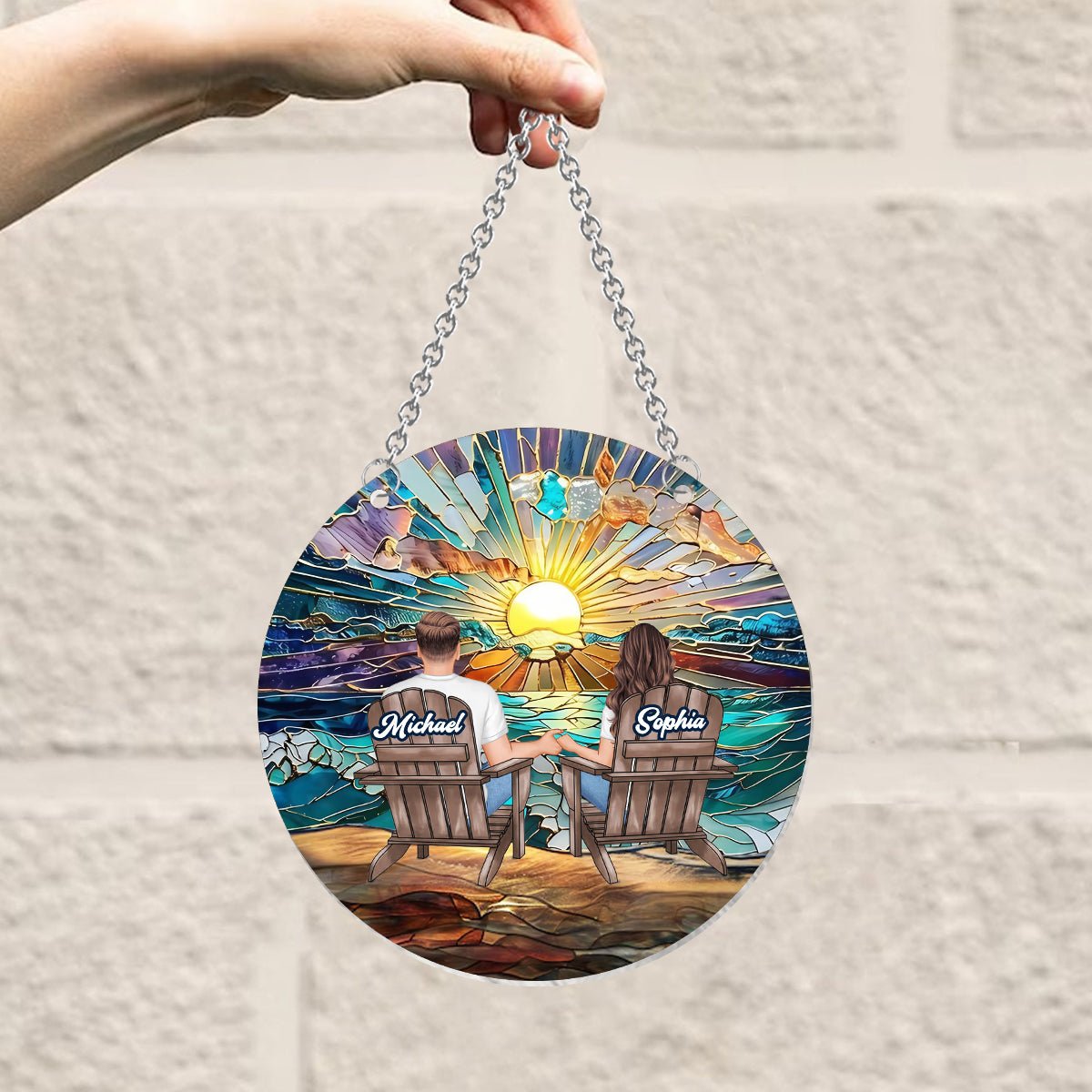 Happy Family Enjoying Romantic Beach - Personalized Couple Window Hanging Suncatcher Ornament