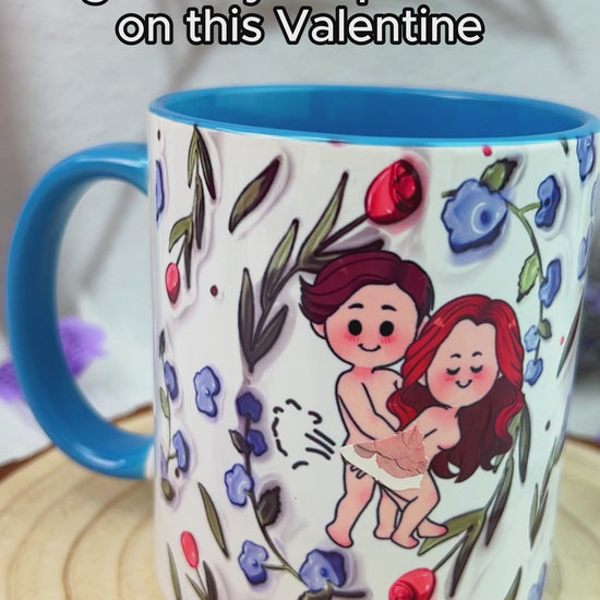 - High quality ceramic mug with two-tone rim, interior, & handle