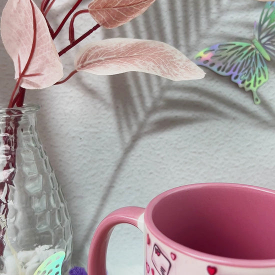 - High quality ceramic mug with two-tone rim, interior, & handle