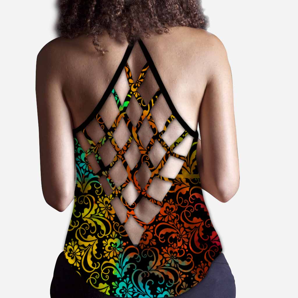 Premium Cross Tank Top: Back lattice is made of triple-layered black stretch fabric and is oversewn (so it cannot be printed)