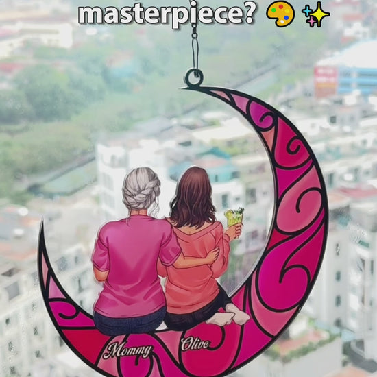 Mother And Children Sitting On The Moon - Personalized Mother Window Hanging Suncatcher Ornament