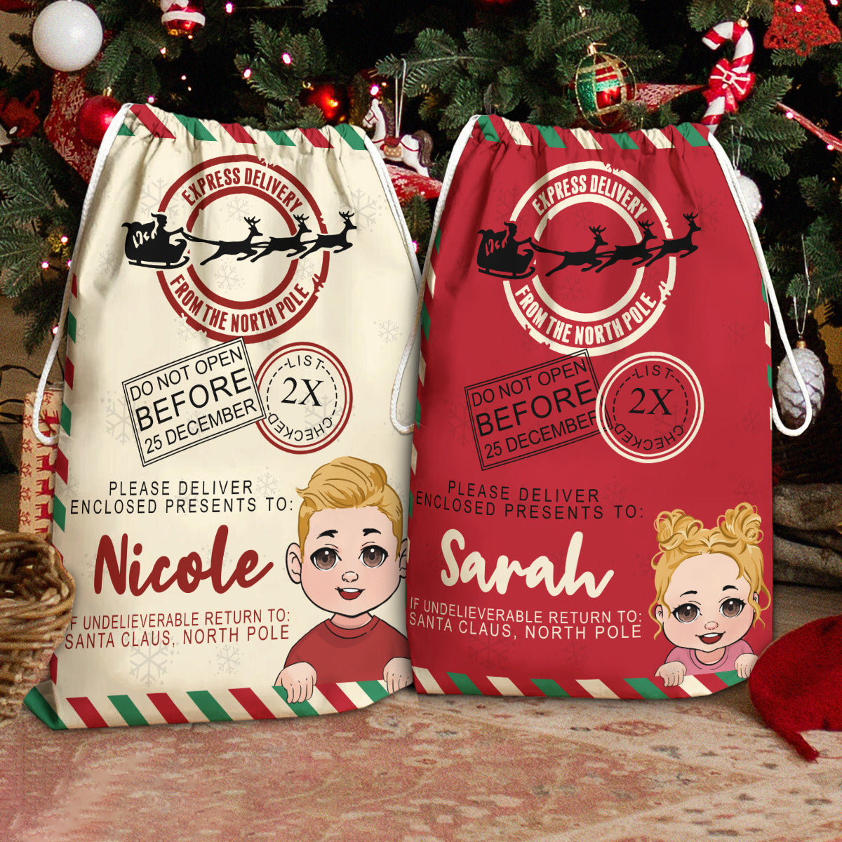 North Pole Express Santa Delivery Sack - Personalized Family Drawstring Tote Bag