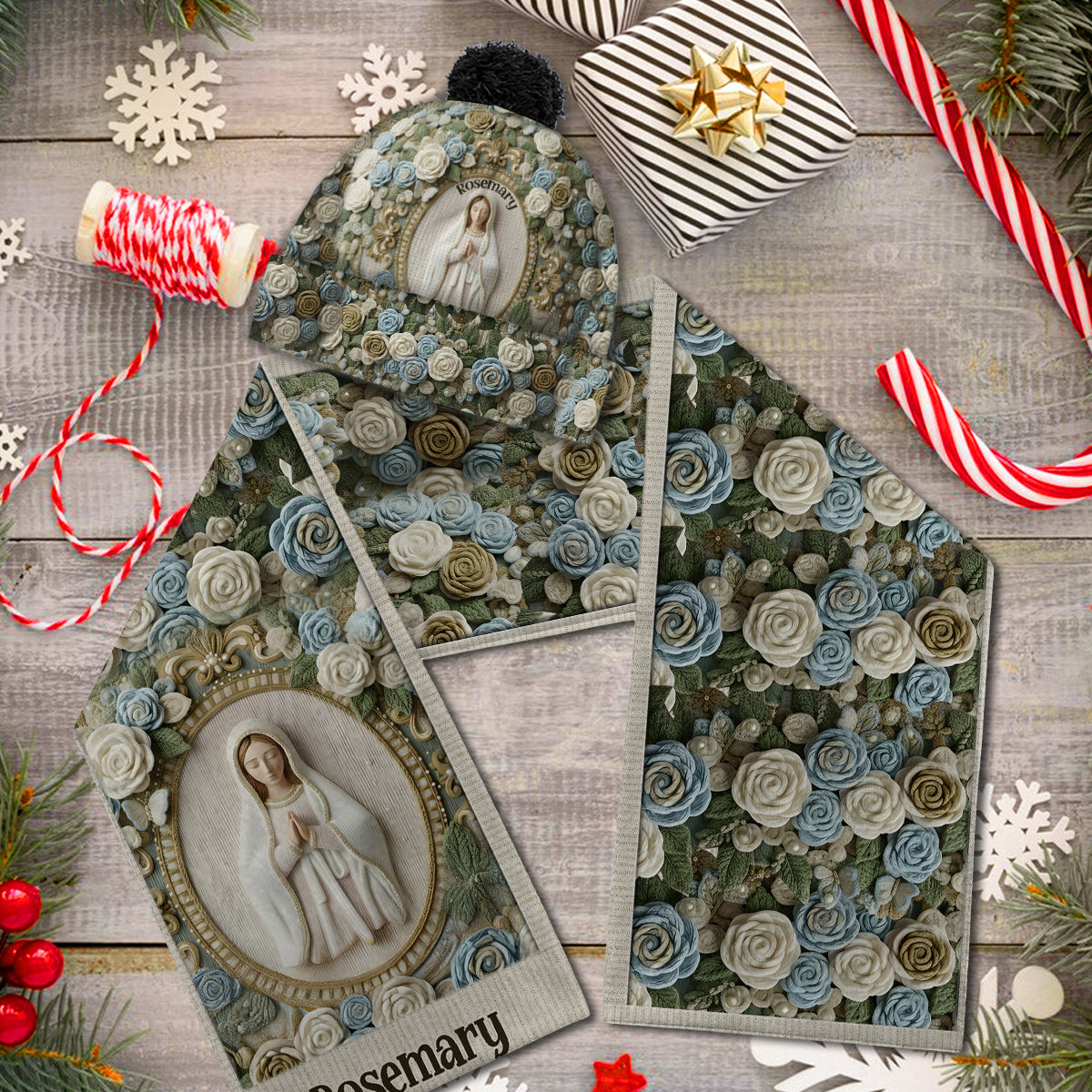 Our Lady's Rose - Personalized Christian Knitted Beanie Hat and Scarf Set