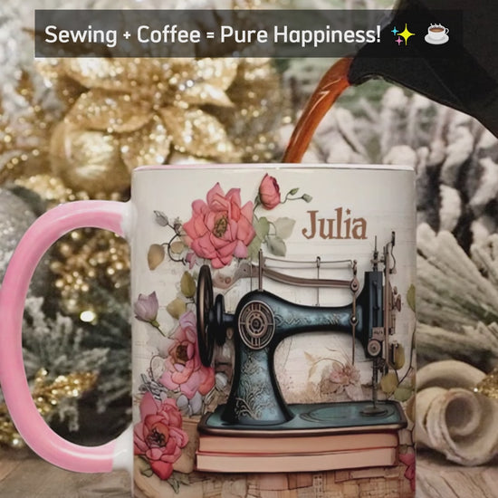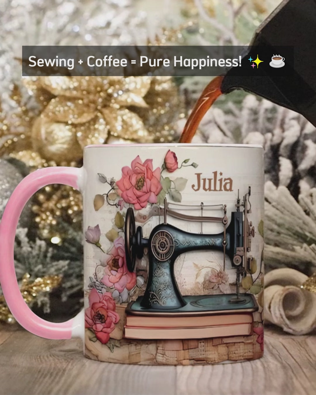 - High quality ceramic mug with two-tone rim, interior, & handle