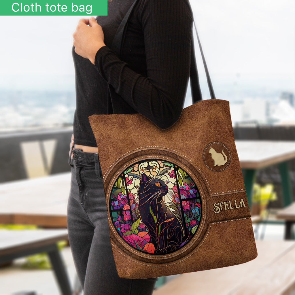 Stained Glass Black Cat - Personalized Black Cat Tote Bag